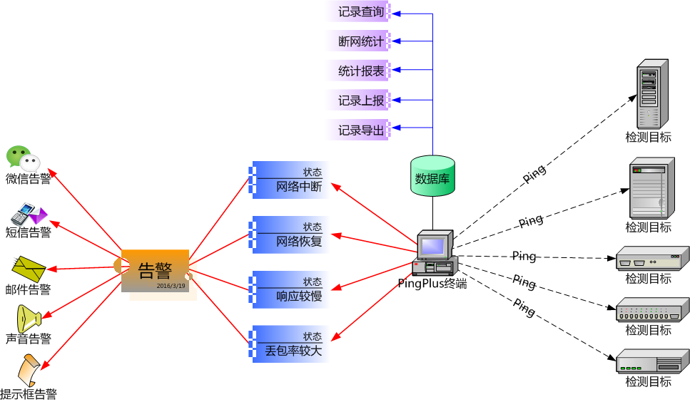 Visual PingPlus提供了多种网络状态告警方式,以及图形化的网络数据报表及统计功能,可以以曲线图的方式提供周、月、年的网络状态报表统计,把网络拓朴图绘制、ICMP、TCP和SNMP网络检测、告警、报表统计进行了完美结合,提供了一体化的解决方案。